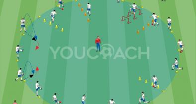 In a circle of about 20 meters prepare the material as it is shown in the picture, it is important to alternate mobility and technical stations. The cones are placed leaving 50 cms between them and...