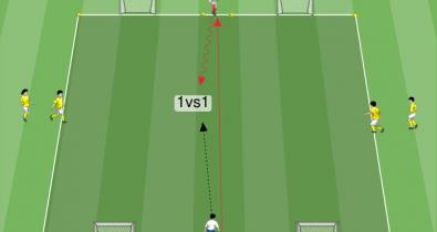 1 v 1 situation with two external lateral flank players with the objective to lose the marker and shoot at goal
