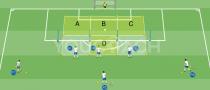 The drill starts with two 2 vs 1 situations in zone A and B.