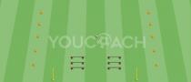 Create a 30x20 meters field using the markers. Create with the markers 2 side zones (one for each side) of about 5 meters for the goalkeepers. Playe 4 vs 4 in the field with goalkeepers defending the goals.