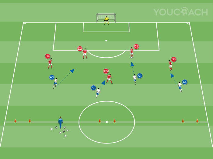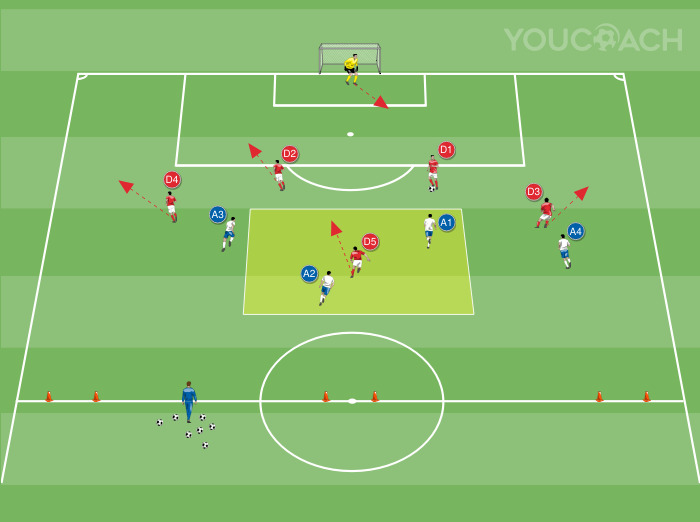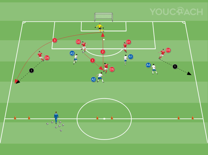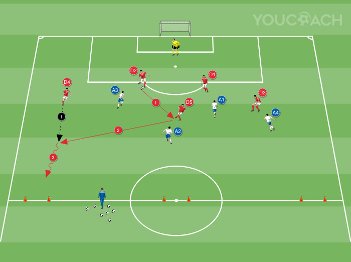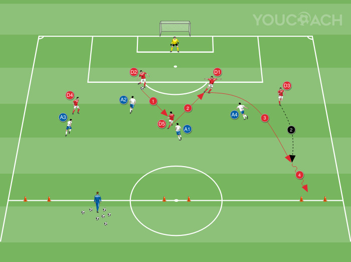 For the drill, use a regulatory half of the field with the goal placed on the end line. Place six cones on the half-court line, forming three 2-meter-wide mini-goals (as in the picture). Divide the players into two teams, five red defenders and four white strikers. The defenders arrange themselves simulating a 4-man defensive line with a central midfielder (D5) in the middle zone. The strikers position themselves with two central strikers and two offensive wings. Ball to the red team (defenders). The goalkeeper defends the goal and plays with the defenders.