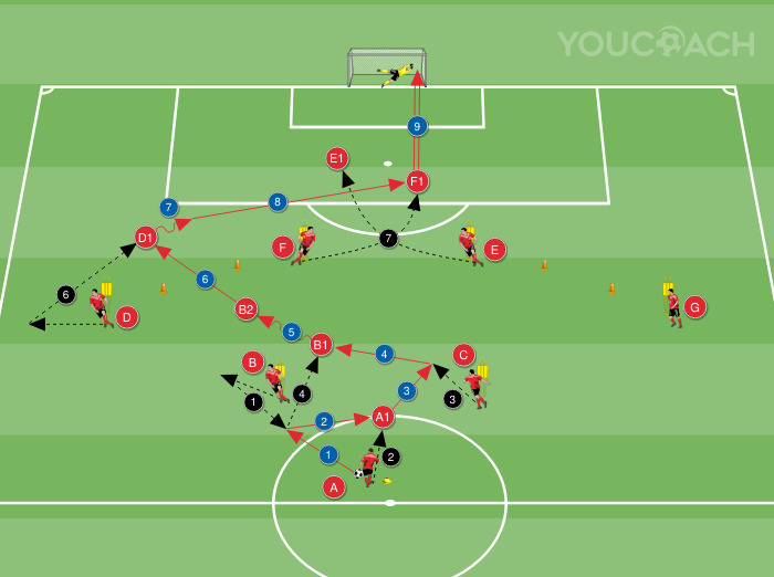 - Player D performs ball control towards the goal while the two forwards E and F cross into E1 and F1 trying not to end up offside with half-moon movements