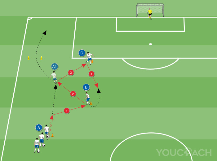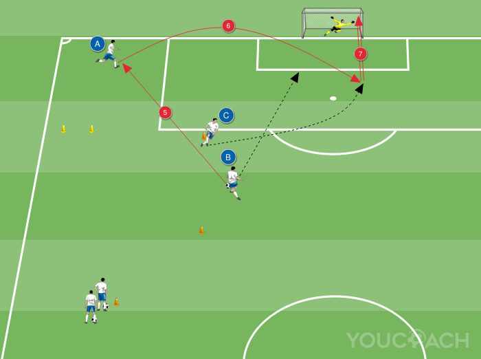 - Received the pass, player A will have to control the ball and cross towards the center of the penalty area for the insertion of B and C who will try to shoot at goal