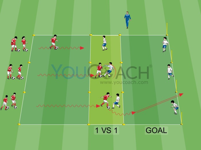 - One player per group starts carrying the ball towards the 1 VS 1 ZONE