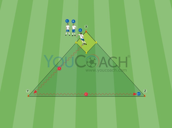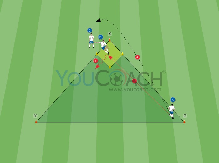 Create an equilateral triangle with sides of 10 meters/11 yards, using 3 cones (X, Y and Z). On the high vertex of the triangle create two 1-meter/yard goals on the right and left of cone X (The diamond). Players A, B and C start right next to cone X. Player A has the ball.